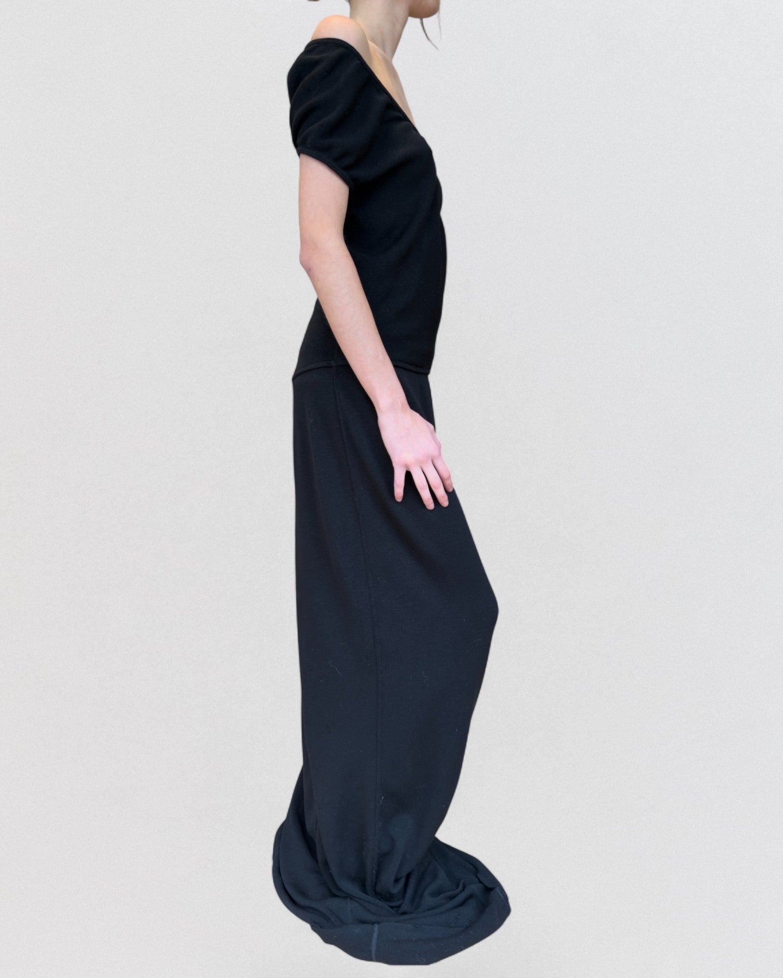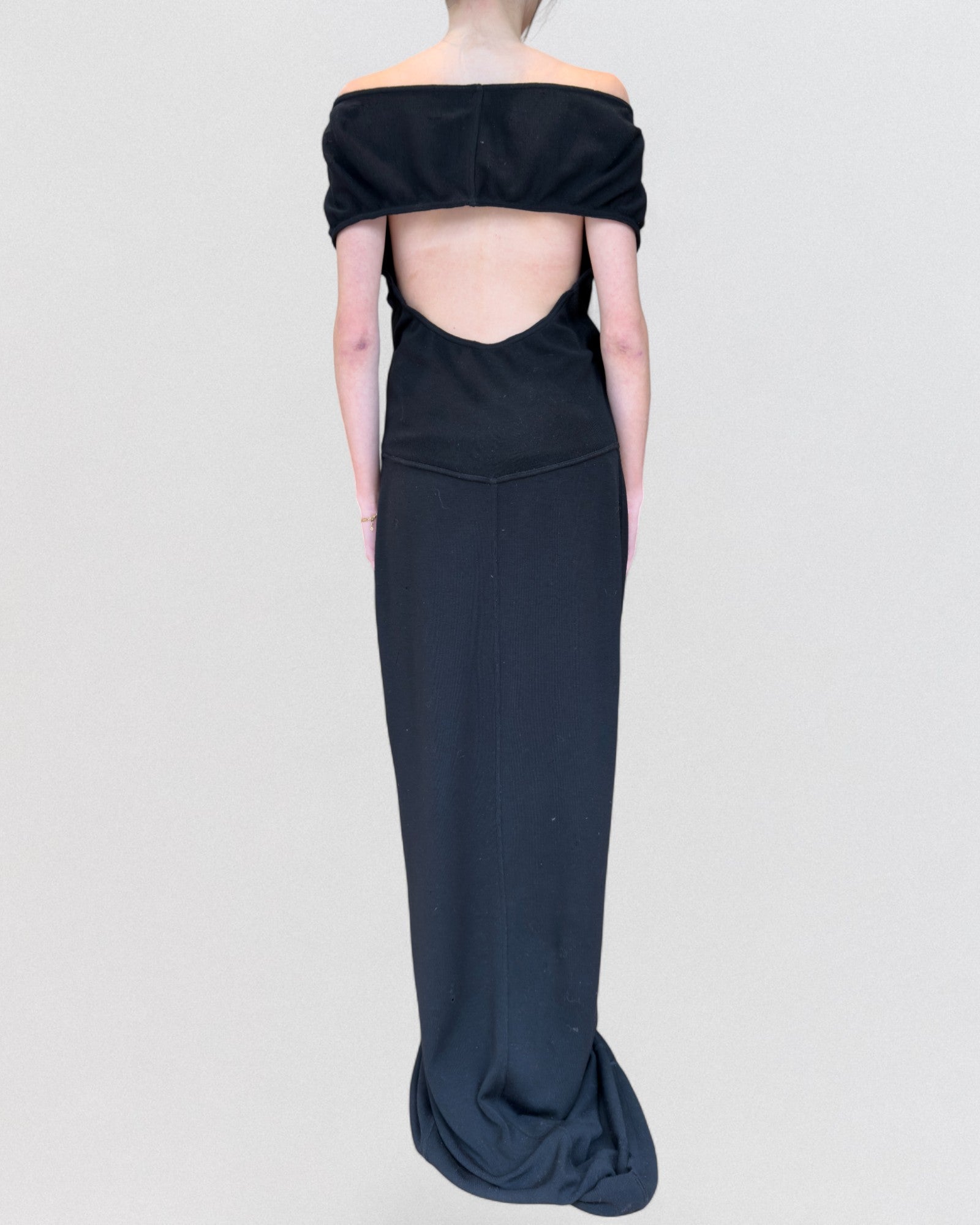 Long black knitted gown by Azzedine Alaïa, Fall/Winter 1987 archive season. Constructed in a fine wool-blend knit, featuring an off-shoulder neckline that drapes elegantly across the shoulders, a fitted body, and a full-length skirt that subtly pools at the hem