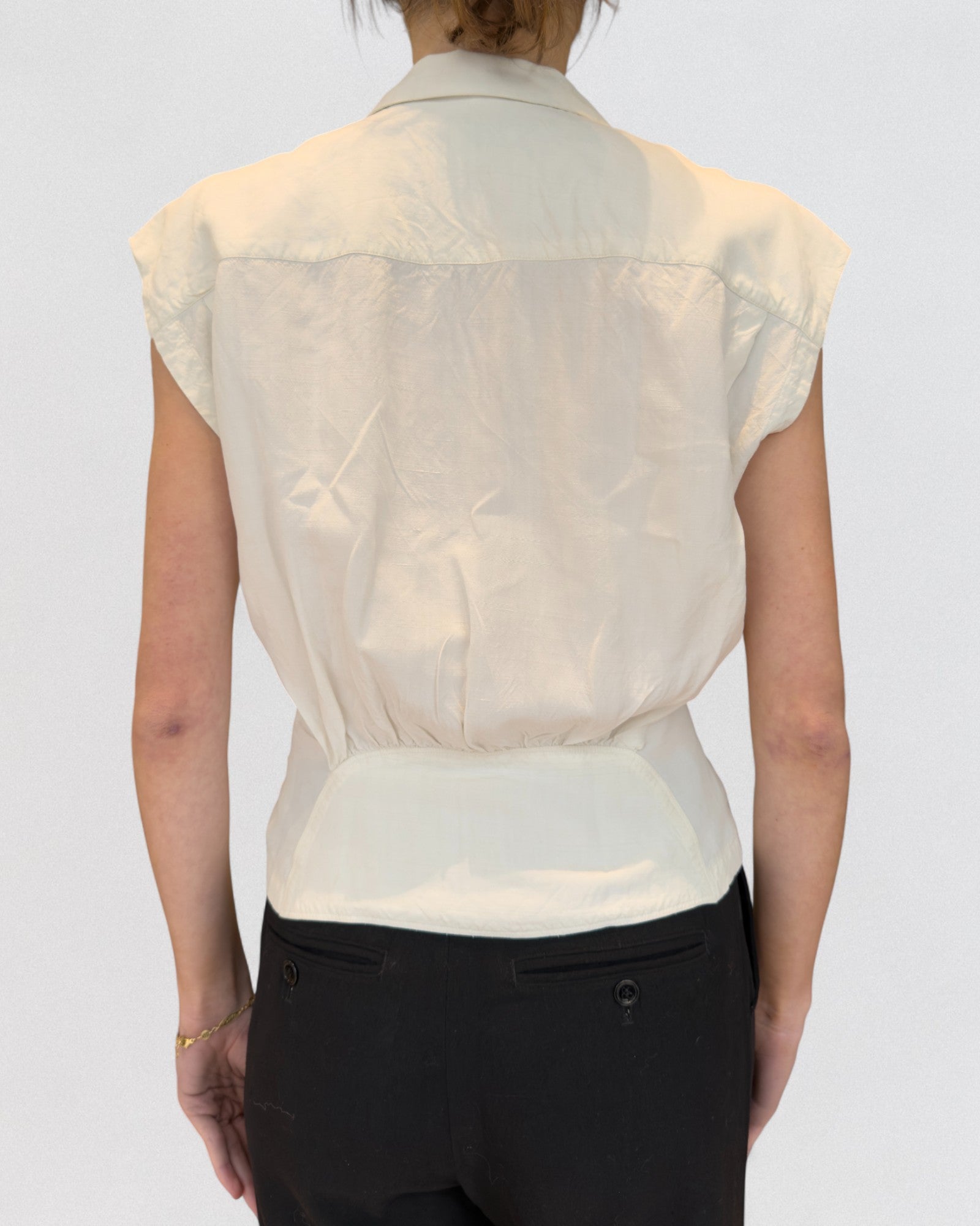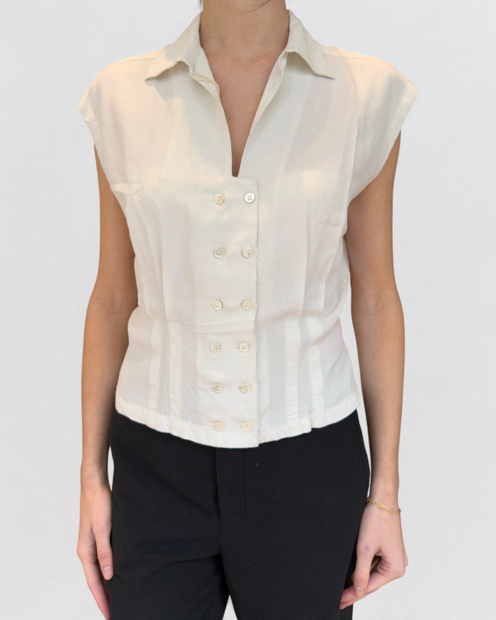 Structured sleeveless blouse in ivory raw silk. Features a fitted waist with dart detailing, a spread collar, and a double-breasted button front. The shoulders are extended with a slight cap sleeve effect, and the back is gently gathered into a shaped waistband for a defined silhouette. Crafted from lightweight raw silk with a subtle sheen and crisp texture.