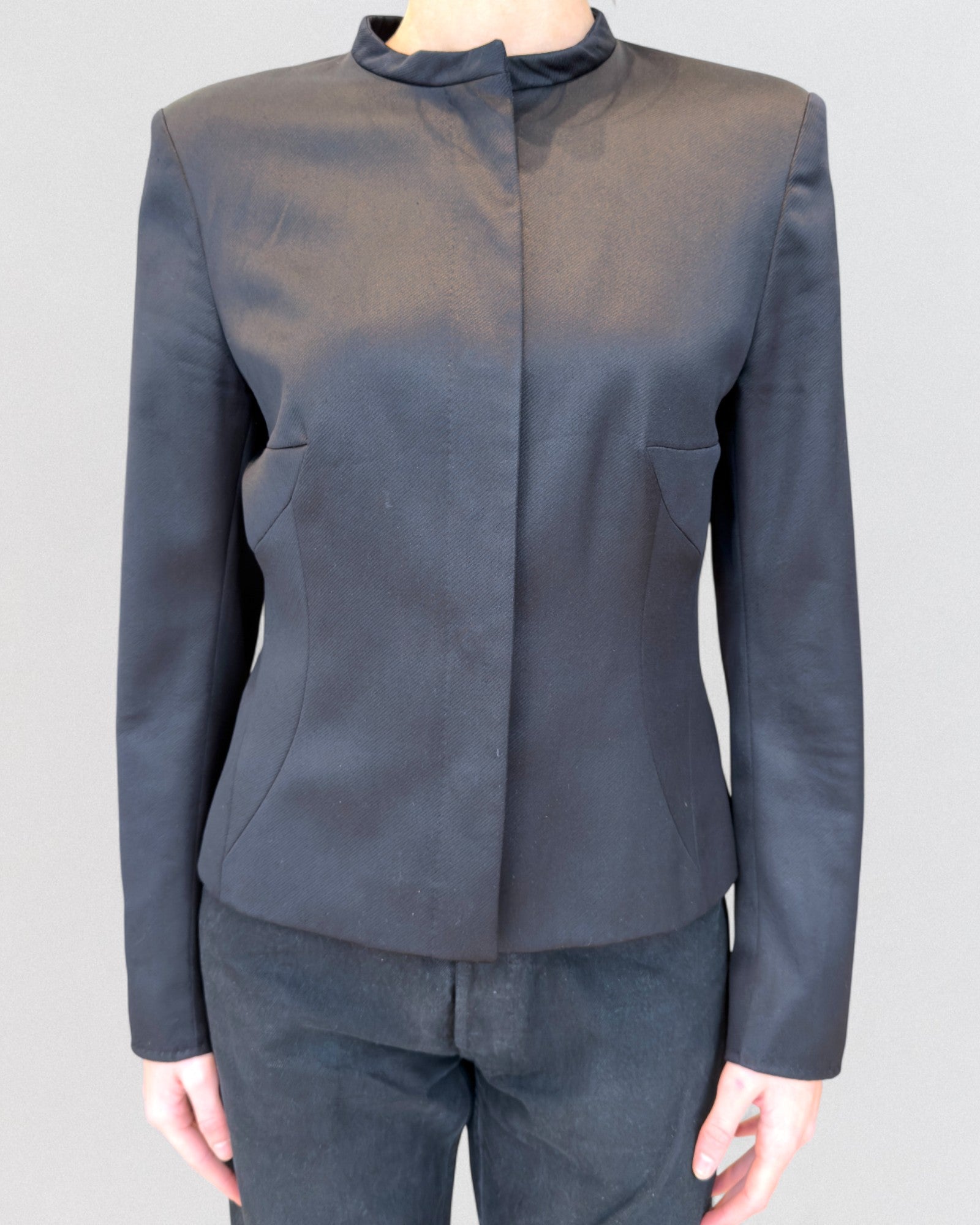 Black tailored jacket from Alexander McQueen, Fall/Winter 2002. Constructed in a structured silhouette with architectural darting, padded shoulders, and a minimalist stand collar. The concealed button placket and precise waist contouring create a sharply defined, sculptural shape — an evolution of McQueen’s early-2000s tailoring vocabulary. Similar versions were featured on the runway that season.