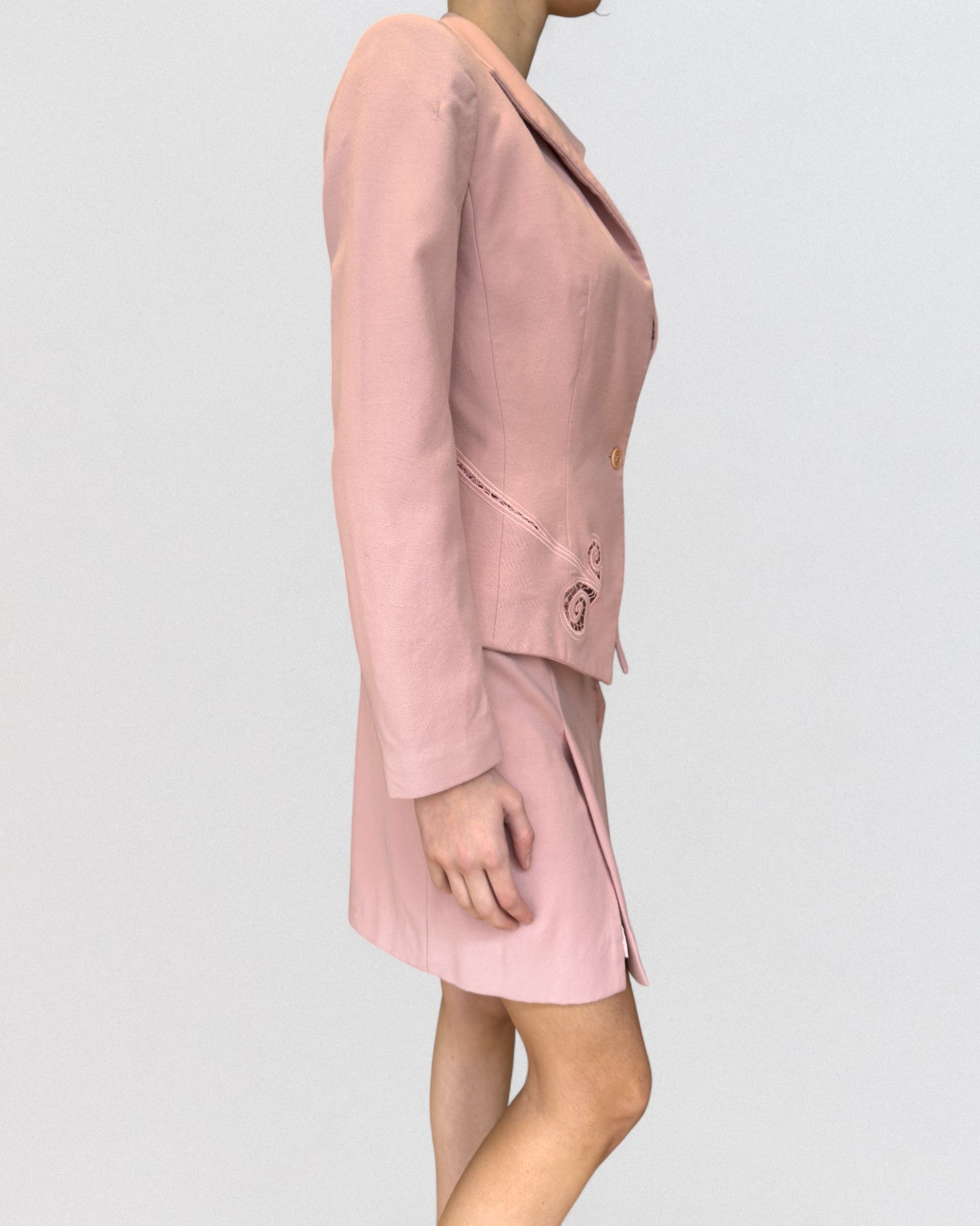 Crafted in soft pastel pink, the ensemble consists of a tailored jacket and coordinating skirt. The jacket features McQueen’s signature sculpted waist and sharp tailoring, with a single-button closure and architectural collar that opens in a fluid, petal-like curve. The matching skirt falls just above the knee and includes a subtle asymmetric slit.