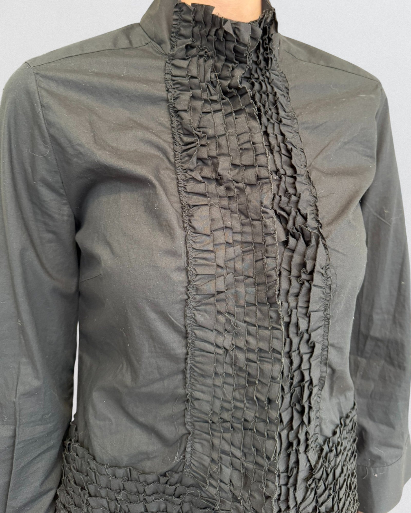 Black cotton shirt from Alexander McQueen, Spring/Summer 2002. Features dense vertical ruffling along the placket and waist, a structured stand collar, and a slightly elongated silhouette.