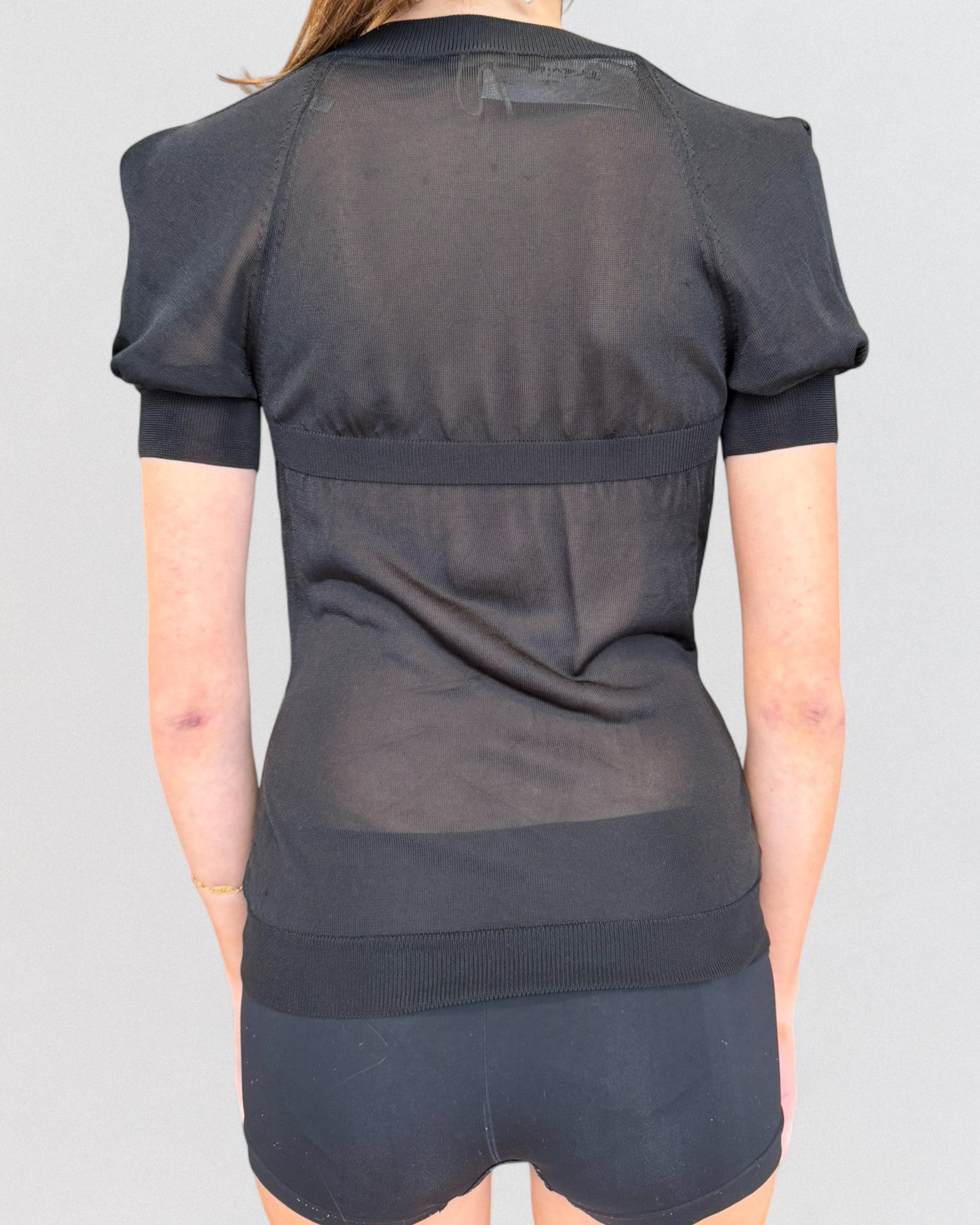 Black silk knit top from Alexander McQueen, Spring/Summer 2007. Features a plunging draped neckline, puffed short sleeves, and ribbed trim framing the shoulders and waist.
