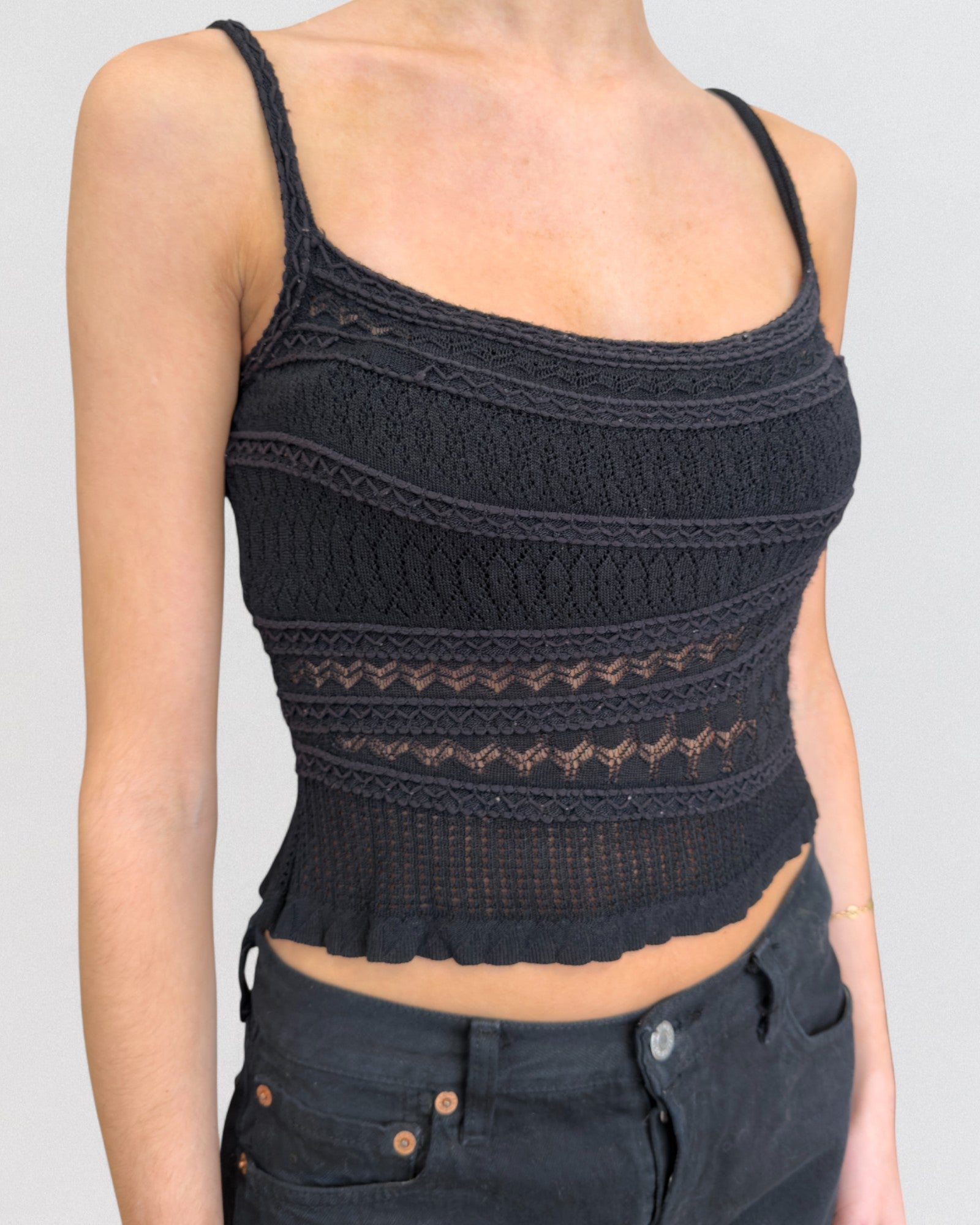 Fitted black knit tank top from Christian Dior by John Galliano Fall 2000. Features fine openwork knit detailing throughout with alternating lace and ribbed patterns. Designed with thin straps, a square neckline, and a scalloped hem. Slightly cropped cut.