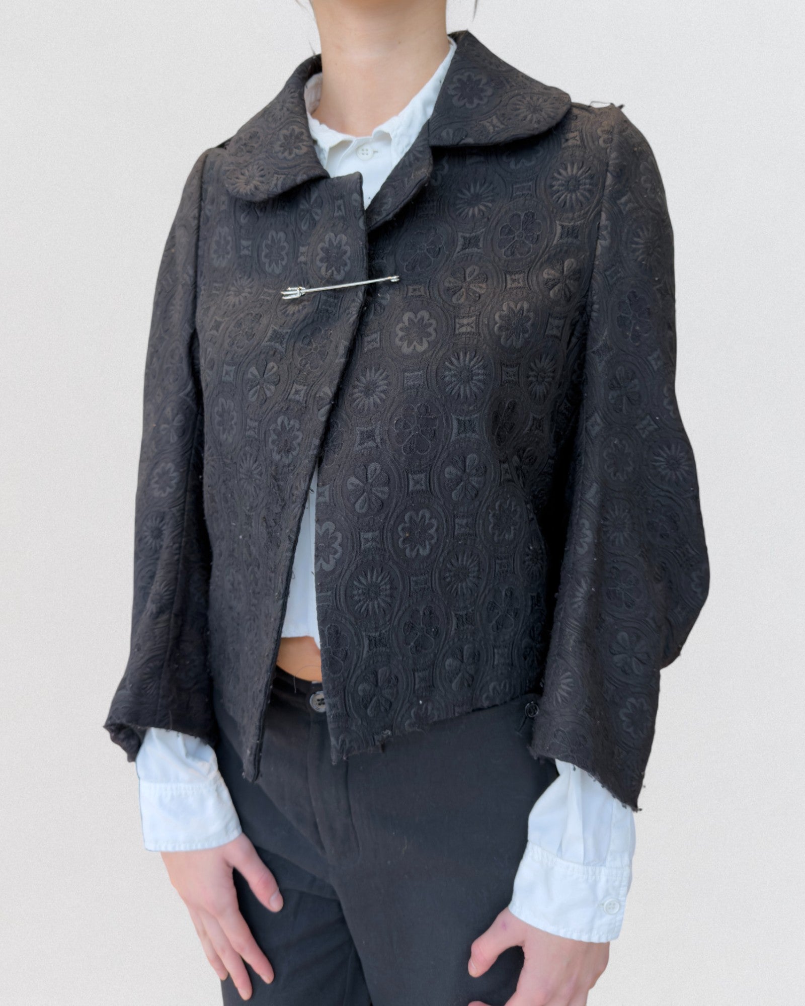 Architectural cropped jacket from Comme des Garçons Fall/Winter 2004, crafted from richly textured black floral jacquard. The silhouette combines a fitted front with a voluminous cape-like back. The back is adorned with a sculptural double bow, integrated into the collar construction.