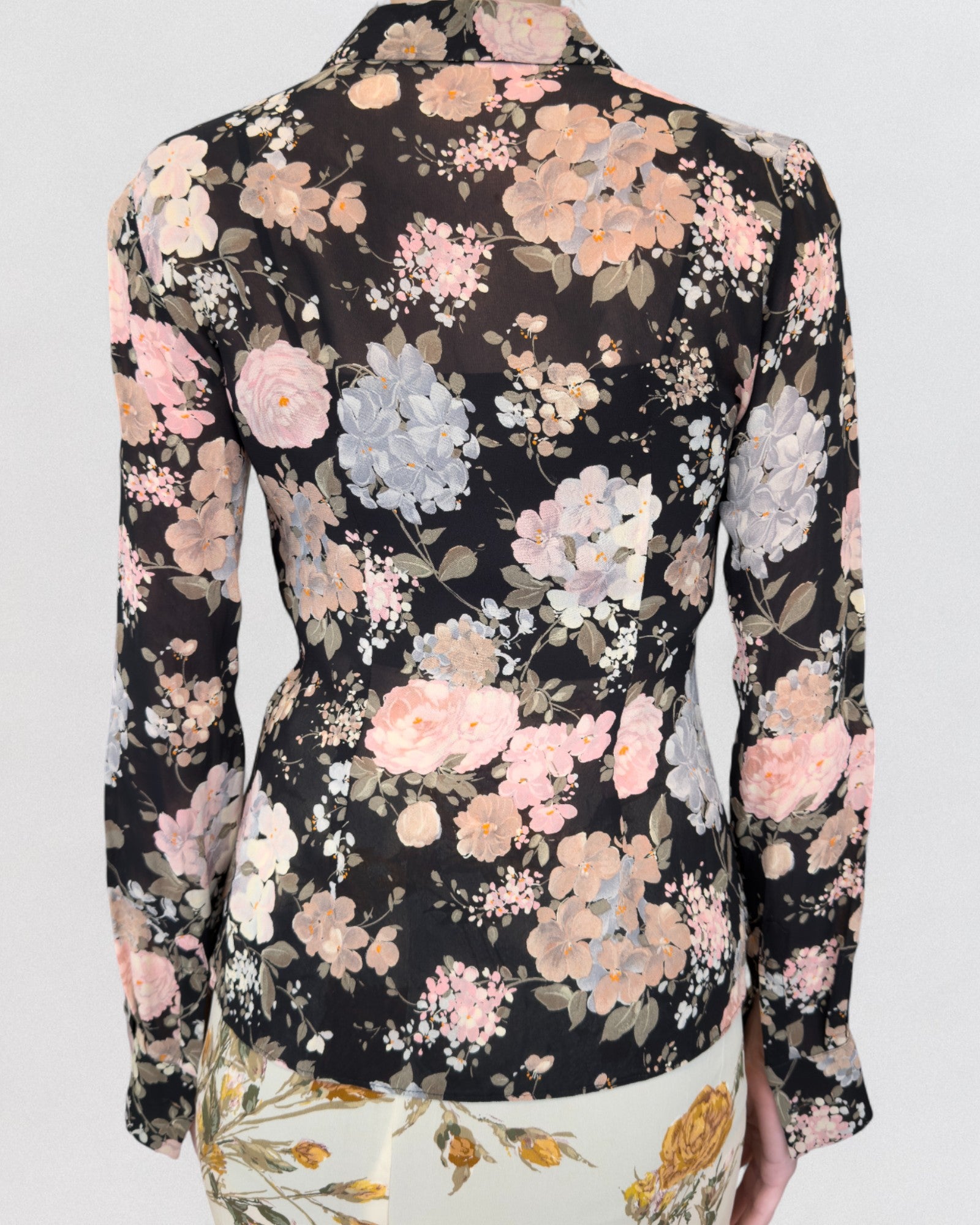 Sheer long-sleeve shirt from Dolce & Gabbana Spring 1997, crafted from lightweight silk chiffon printed with a floral pattern in muted yellow, pink, and green tones. Features a classic pointed collar, button-down front, and a slightly fitted cut. The cuffs close with small mother-of-pearl buttons.