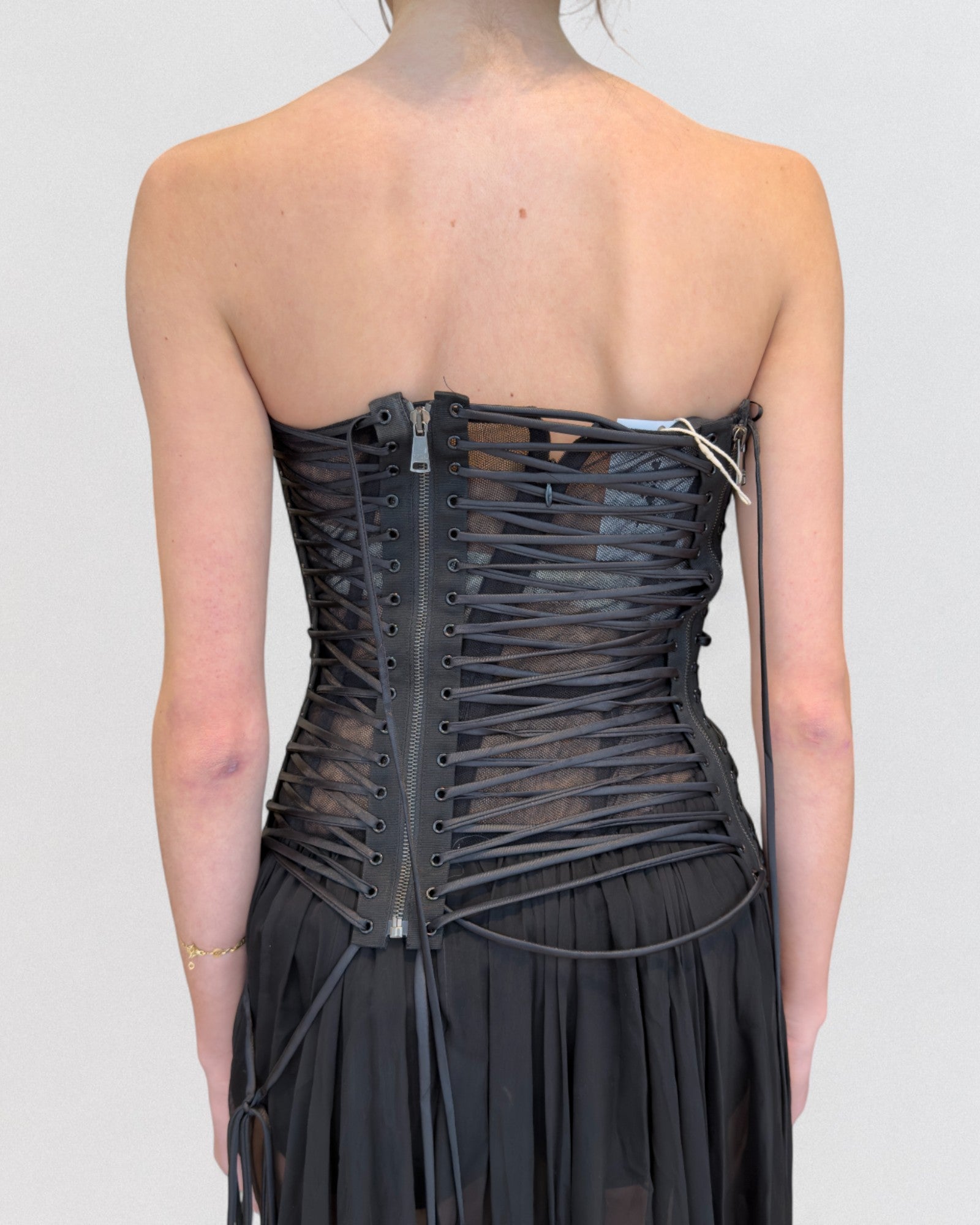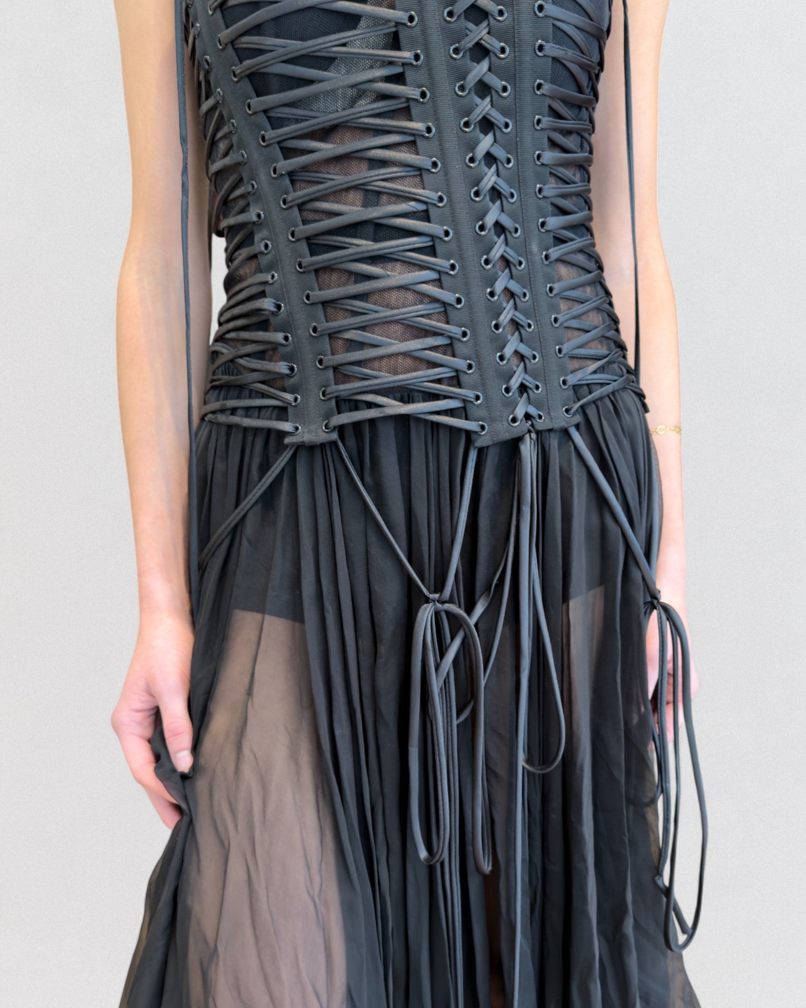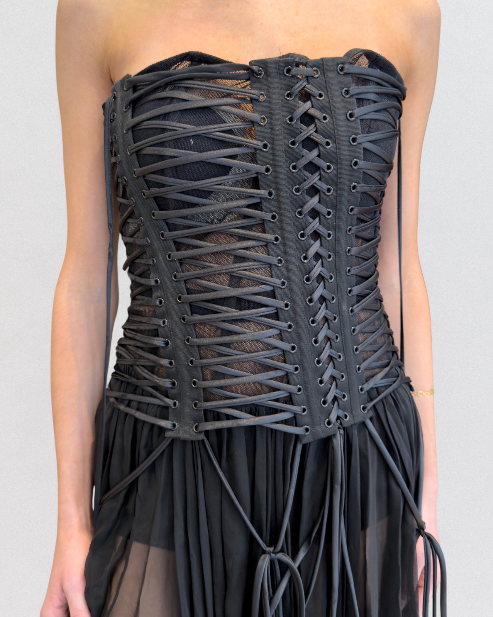 Black strapless dress from Dolce & Gabbana Spring 2018 collection. Features a structured corset bodice with extensive lace-up detailing throughout the front and sides, paired with a semi-sheer chiffon skirt. The cords can be adjusted for fit and drape, allowing the dress to contour the body closely.