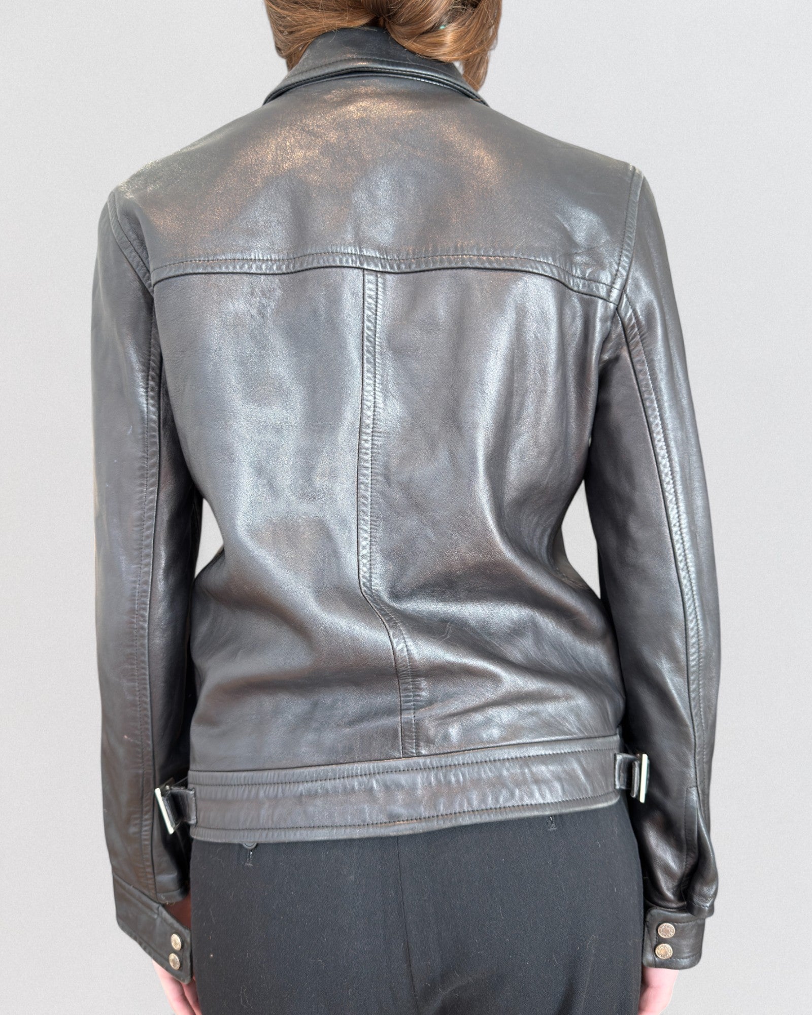 Black lambskin leather jacket from Gucci, Fall/Winter 1998, designed under Tom Ford. Features a sharp collar, fitted silhouette, and two front zip pockets with minimalist silver hardware. From a collection embodying Ford’s sleek, modern sensuality — where precision tailoring and subtle eroticism redefined late-1990s luxury.