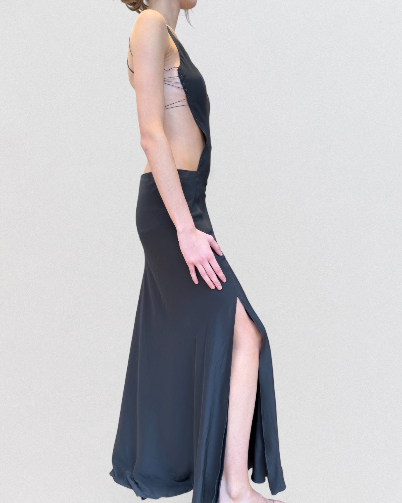 Black silk full-length evening gown from Gucci F/W 2002 (Tom Ford era). Features a deep V-neck halter front, dramatic cut-outs at the sides/back with fine wrap straps, front thigh-slit skirt and fluid train. Marked “Press Office” on the tag — a rare sample made for media/showroom use. Excellent condition.