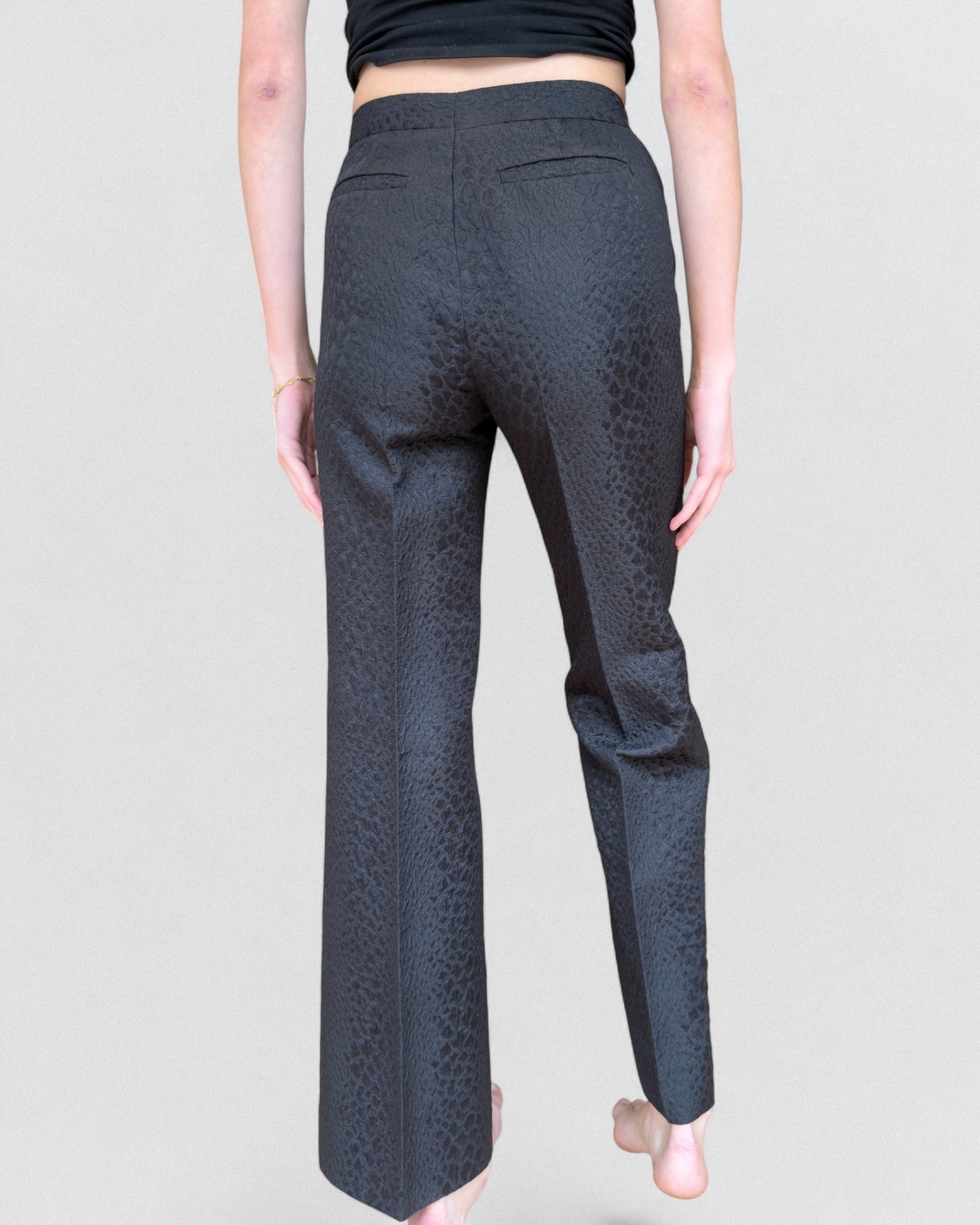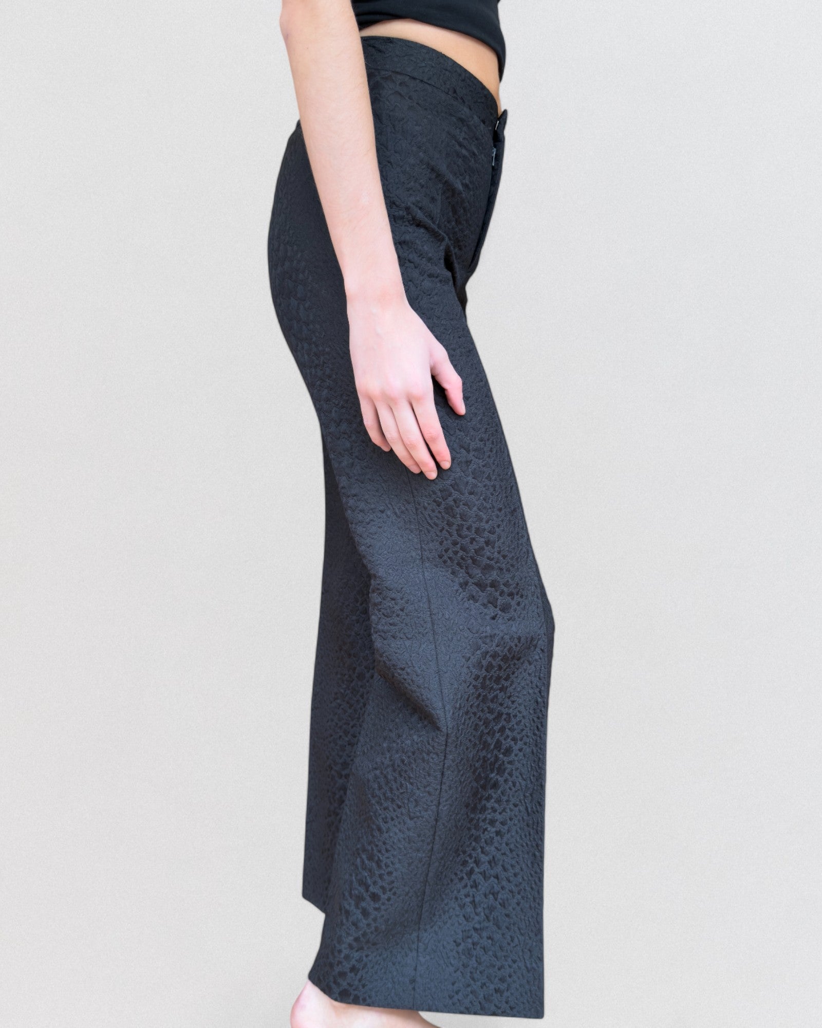 Gucci by Tom Ford Spring/Summer 2000 black embossed trousers. Mid-rise silhouette with straight leg and pressed creases. Constructed from textured jacquard fabric with subtle reptile-inspired relief pattern. Features concealed side zipper, waistband with belt loops, and welt back pockets. Unlined.
