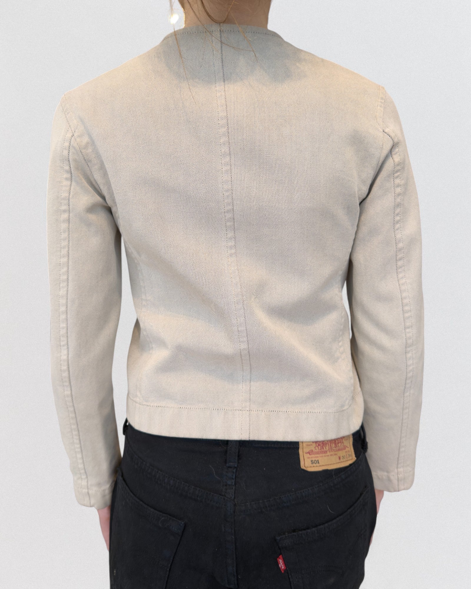 Minimalist taupe canvas jacket from Hermès by Martin Margiela, Spring/Summer 2001. Constructed in the house’s signature pared-down aesthetic, it features a collarless neckline, a cropped, clean silhouette, and the distinctive Hermès toggle closures in palladium hardware.