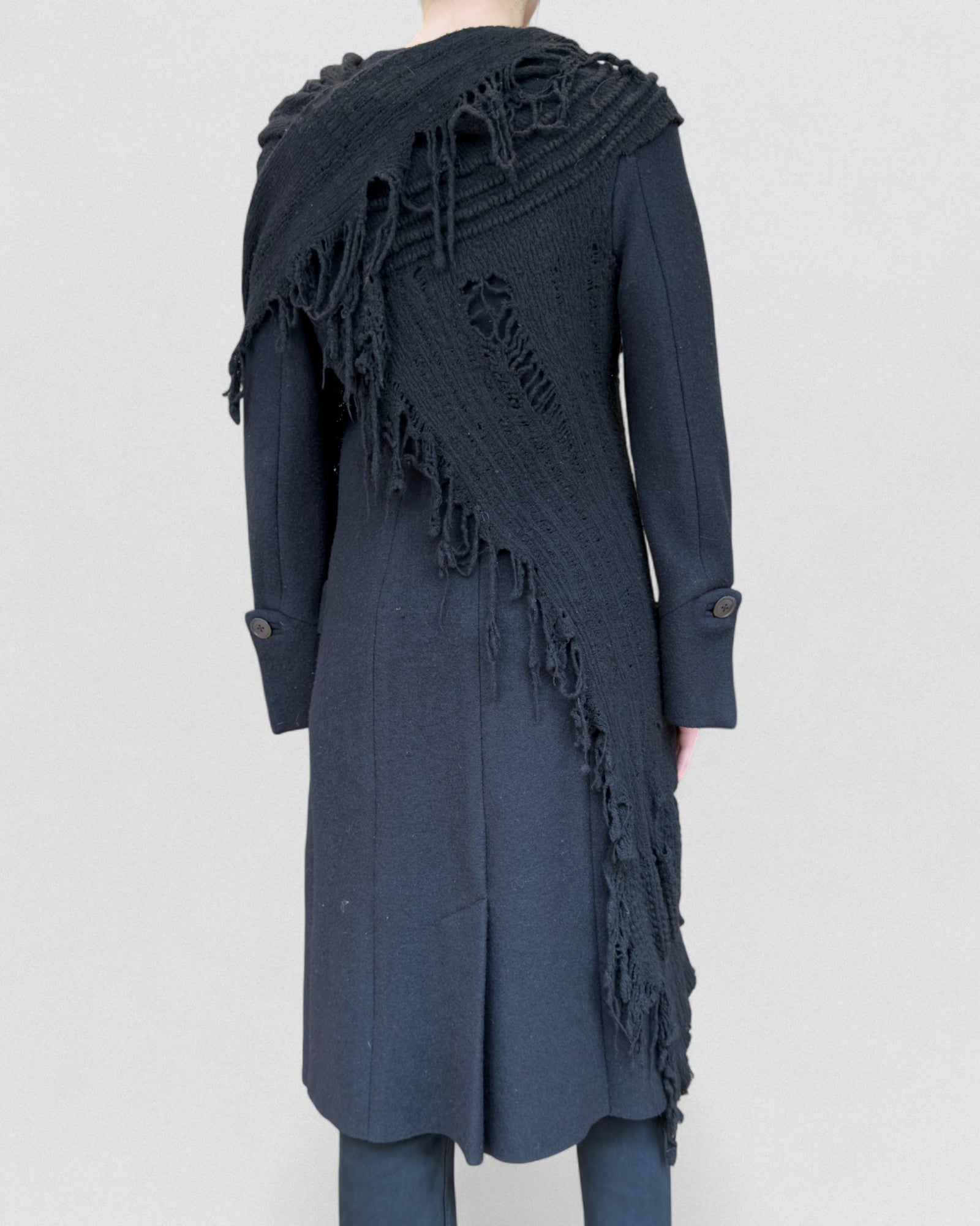 Constructed from dense black wool, it features a dramatic asymmetrical knit overlay that wraps around the shoulders and cascades diagonally across the body, forming long distressed fringes and tactile unraveling effects. The silhouette remains structured through the body, with large tonal buttons, notched cuffs, and a precise, architectural drape—juxtaposing the raw, deconstructed knit detailing.