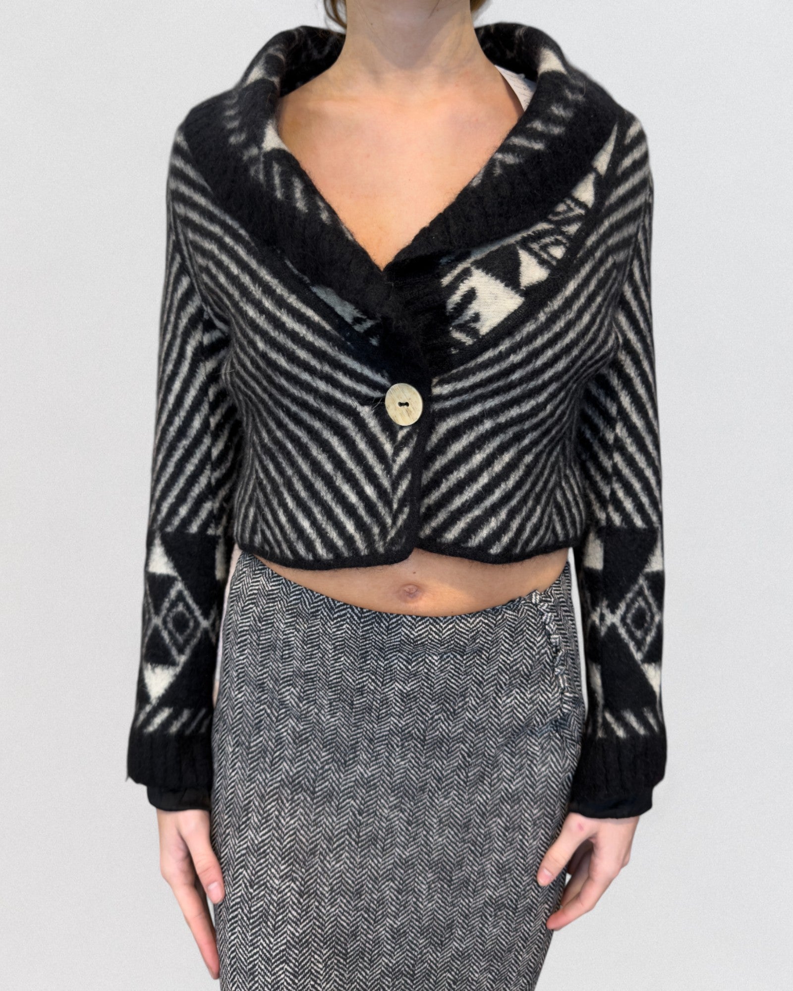 Cropped jacket from John Galliano Fall 1999, crafted in a soft mohair–angora blend. Features an abstract geometric print in black and cream, with a sculptural shawl collar and single-button closure.