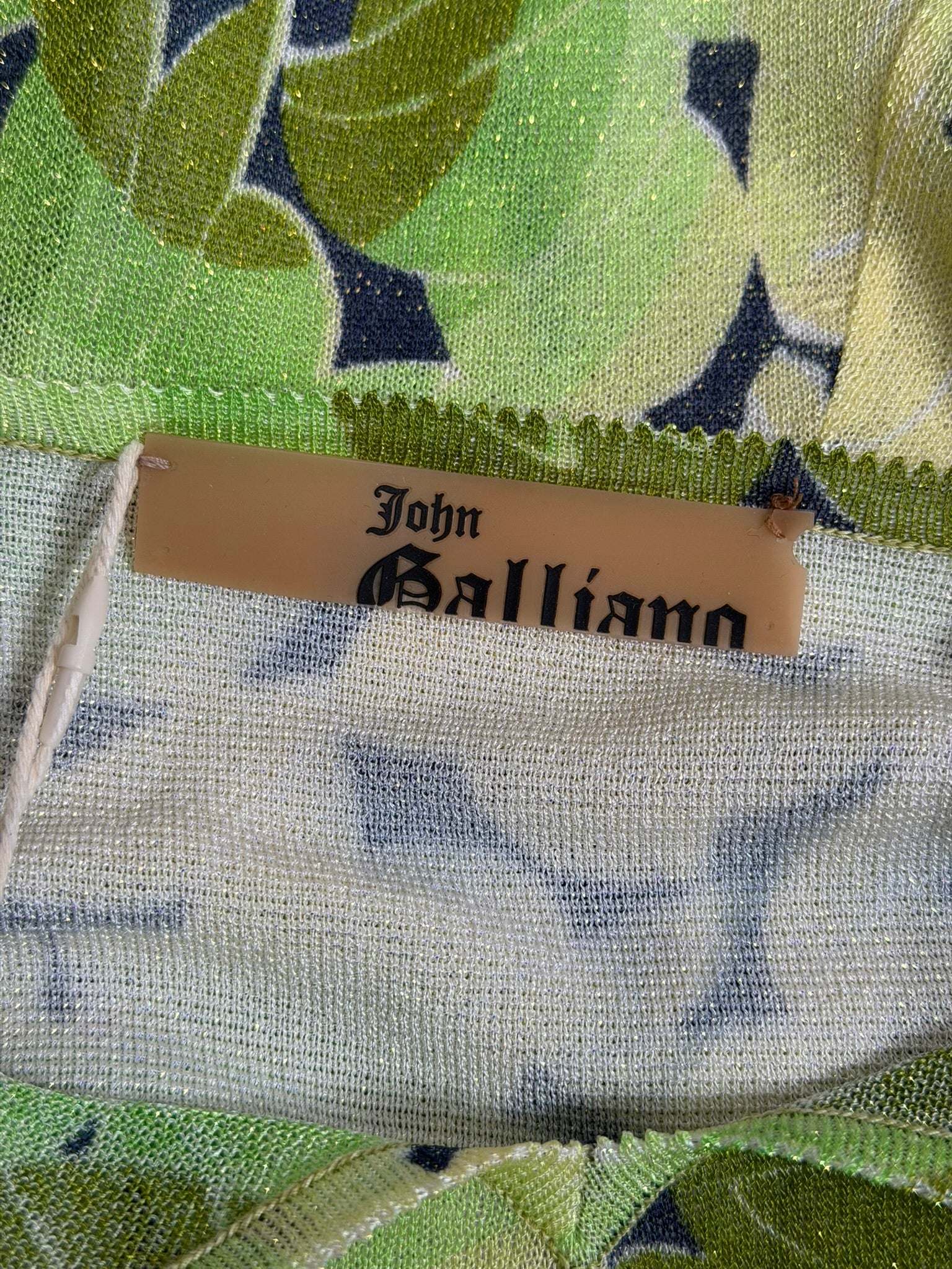 Unreleased sample dress from John Galliano’s Spring/Summer 2003 collection, featuring the same printed viscose jersey used in the runway look. This print appeared prominently on the catwalk, styled as a draped sari over a leather jacket