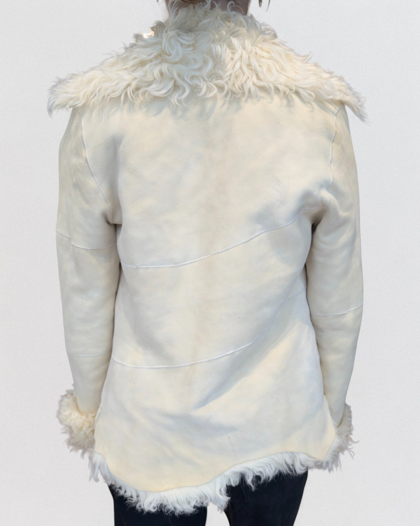 Ivory leather shearling jacket from Plein Sud, Fall/Winter 2002. Constructed from soft lambskin suede with plush Mongolian lamb fur trim at the collar, cuffs, and hem. Features an open front with an asymmetrical cut and dropped shoulders that enhance its relaxed yet structured silhouette.
