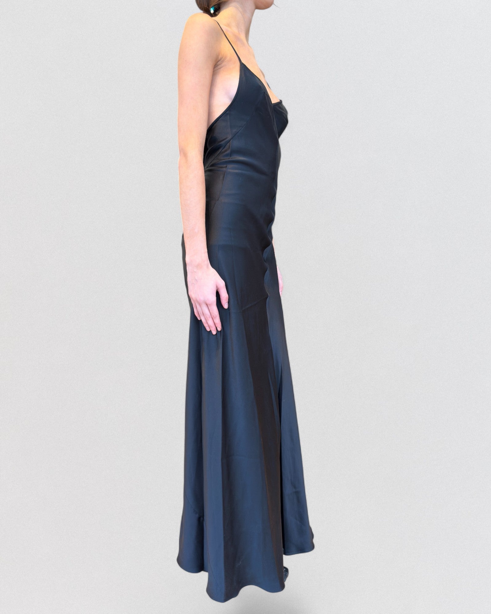 Black silk gown from Plein Sud Sun, Spring/Summer 1999. Bias-cut silhouette featuring delicate spaghetti straps and a paneled construction combining two contrasting black silks — one matte, one satin — creating subtle tonal depth and fluid movement.