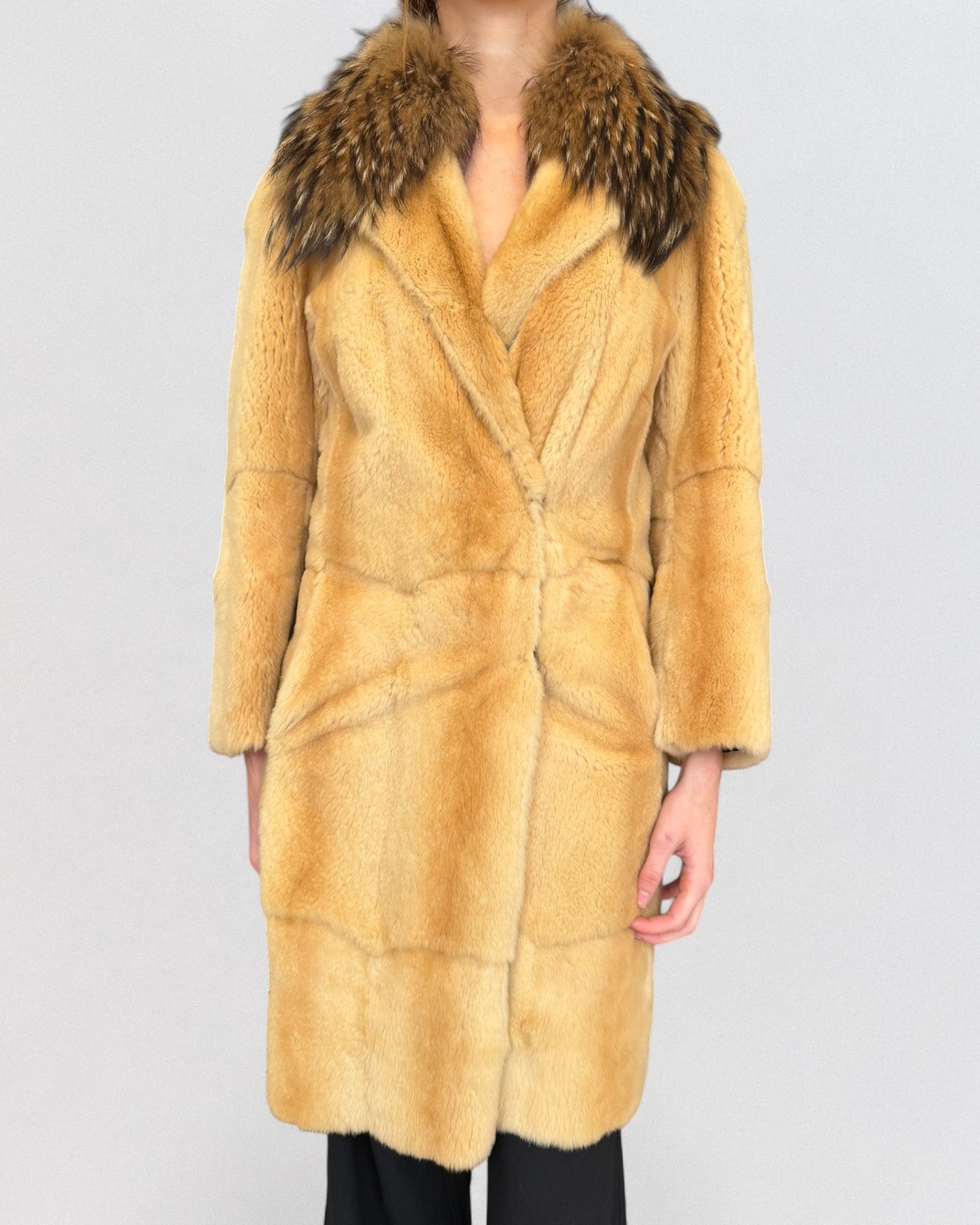 Mid-length fur coat from Prada, Fall/Winter 2000. Constructed in plush honey-toned fur with a voluminous natural raccoon collar, featuring a tailored silhouette that merges utilitarian structure with opulent texture. From a collection that juxtaposed raw materials and refined craftsmanship, reflecting Miuccia Prada’s exploration of tactile luxury and subversive femininity at the turn of the millennium.