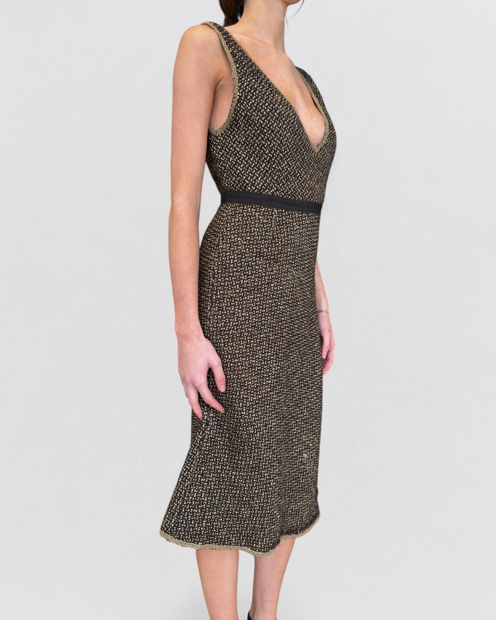 Sleeveless tweed midi dress from Prada, Fall/Winter 2000. Featuring a deep V-neckline, fitted waist with grosgrain ribbon detailing, and subtle metallic threading that catches the light within the textured weave. From a collection characterized by industrial elegance and tactile contrasts, where Miuccia Prada reimagined classic fabrics like tweed through a lens of minimalist sensuality.