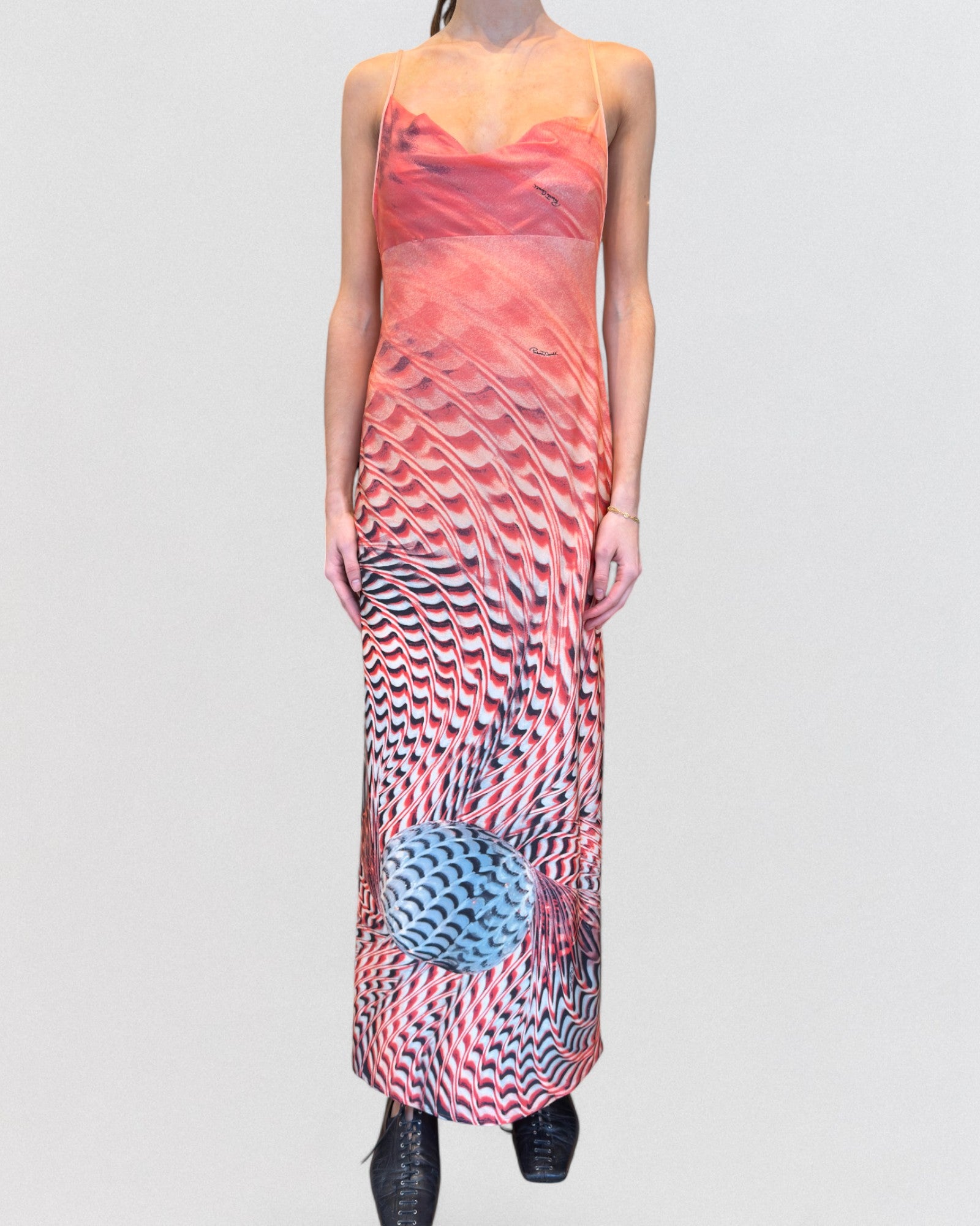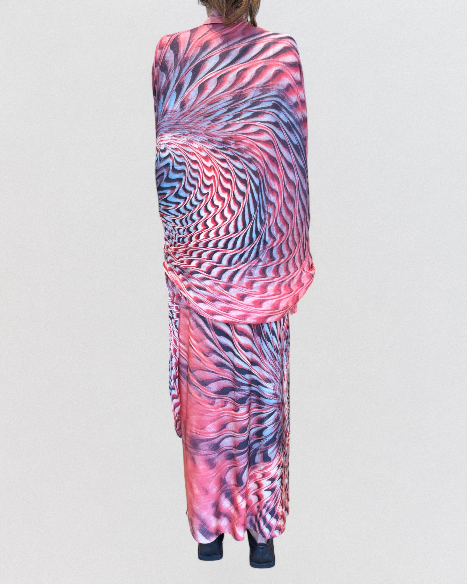 Optical tie-dye evening dress from Roberto Cavalli, Spring/Summer 2001. A floor-length synthetic gown featuring a hypnotic vortex print in coral, grey, and black tones, paired with a matching silk shawl designed to drape over the shoulders and soften the exposed neckline. From a collection defined by psychedelic patterns, fluid silhouettes, and Cavalli’s signature celebration of liberated, body-conscious glamour.