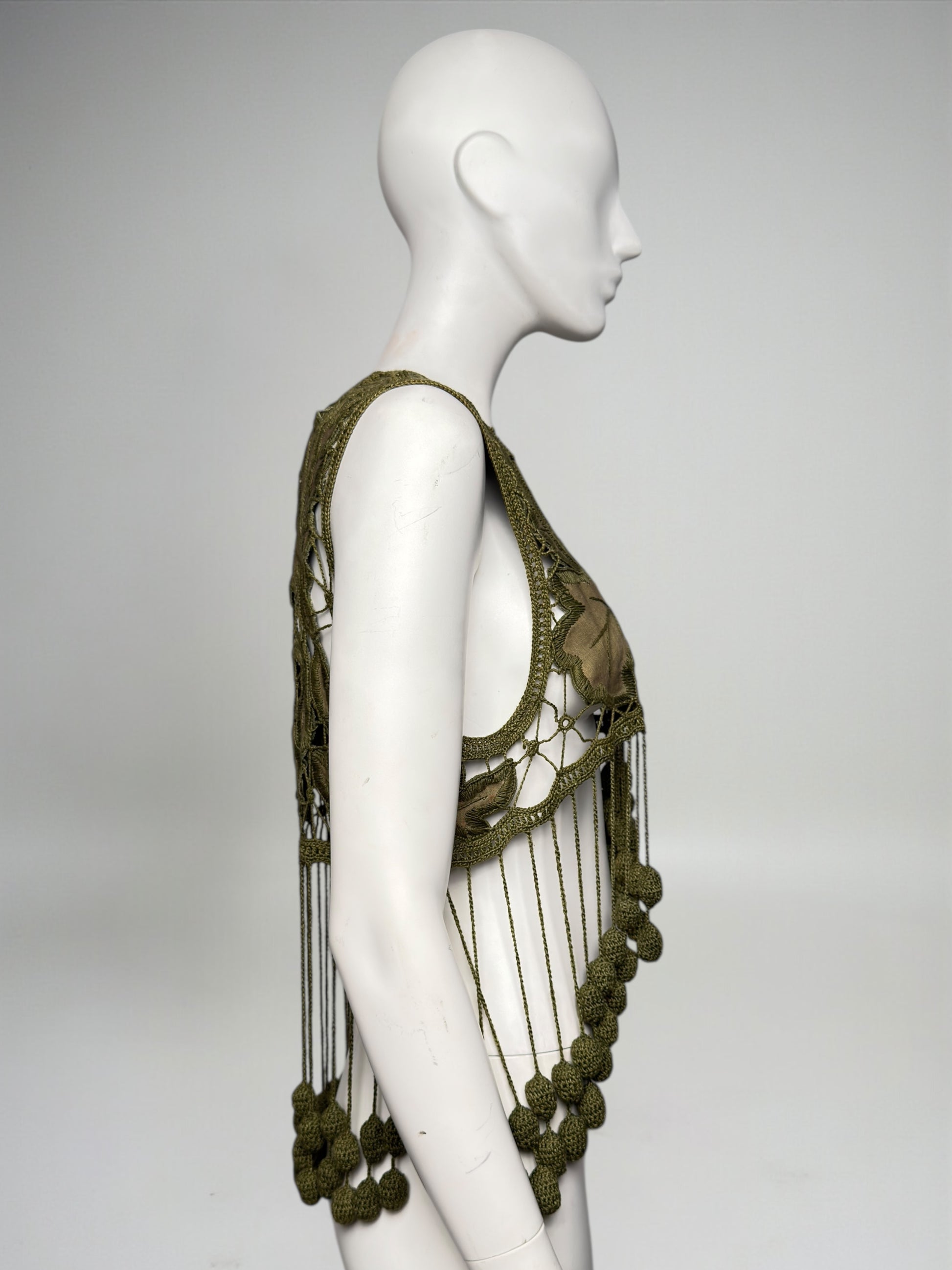 Romeo Gigli Spring 1990 olive-green vest featuring an open crochet construction with botanical appliqué panels across the chest. The piece is cut with a deep V-neckline and fastens at the front with a single covered button. Long knotted cords fall from the lower edge, each ending in tightly crocheted oval tassels that form a scalloped, fringed hem