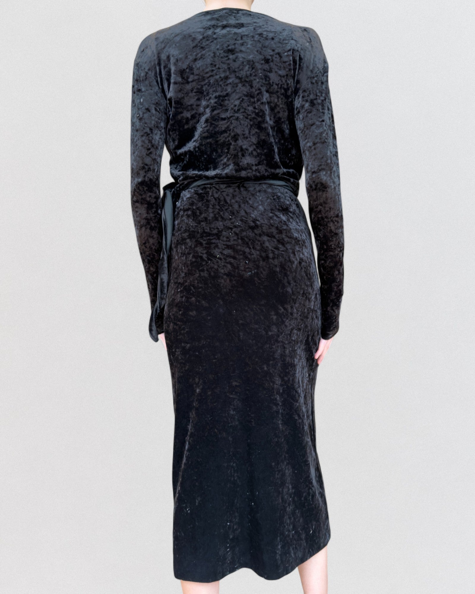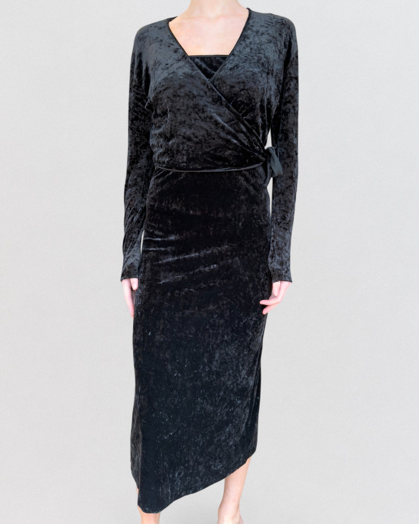 Black crushed velvet two-piece dress from Yohji Yamamoto Fall/Winter 1986. Comprises a fitted slip dress with thin straps and a long-sleeve wrap layer worn over it. The outer wrap crosses at the front and ties at the waist with a tonal velvet ribbon. Mid-length skirt with a slightly irregular hemline.