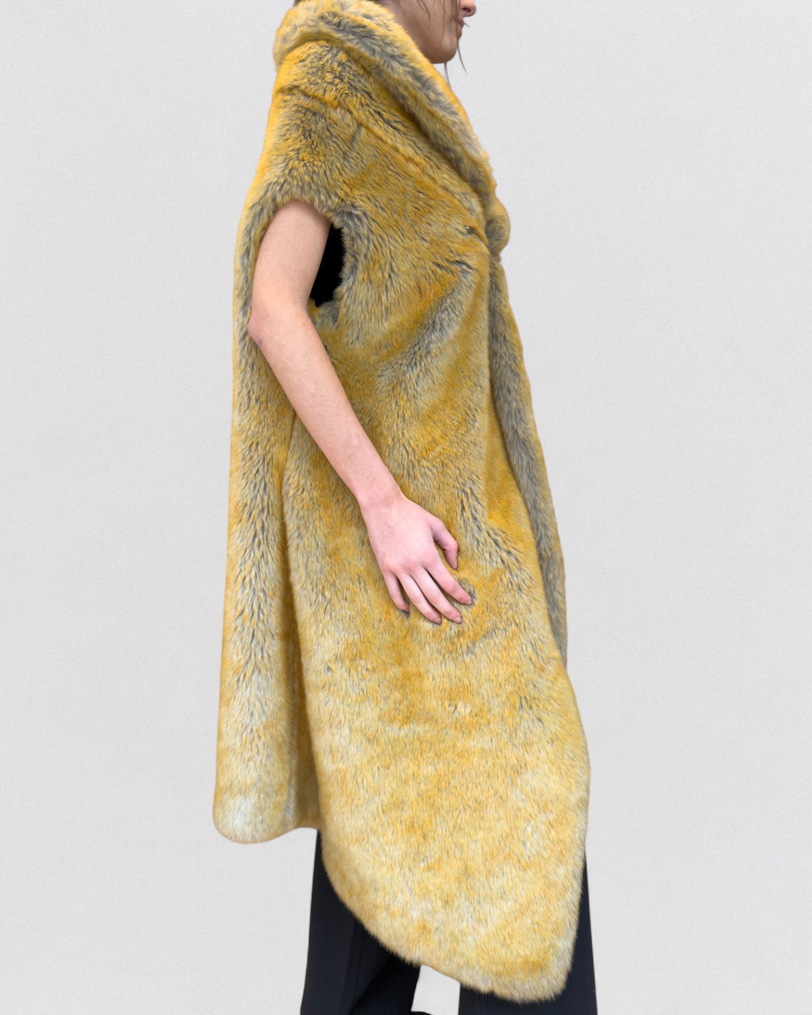 Sleeveless faux fur coat from Yohji Yamamoto Fall/Winter 1996, crafted in a soft, dense synthetic pile with a subtle tonal blend of golden yellow and muted grey. The construction features wide, curved shoulders, a voluminous collar that can stand or fold, and an asymmetrical wrap front fastened with a single oversized safety pin.