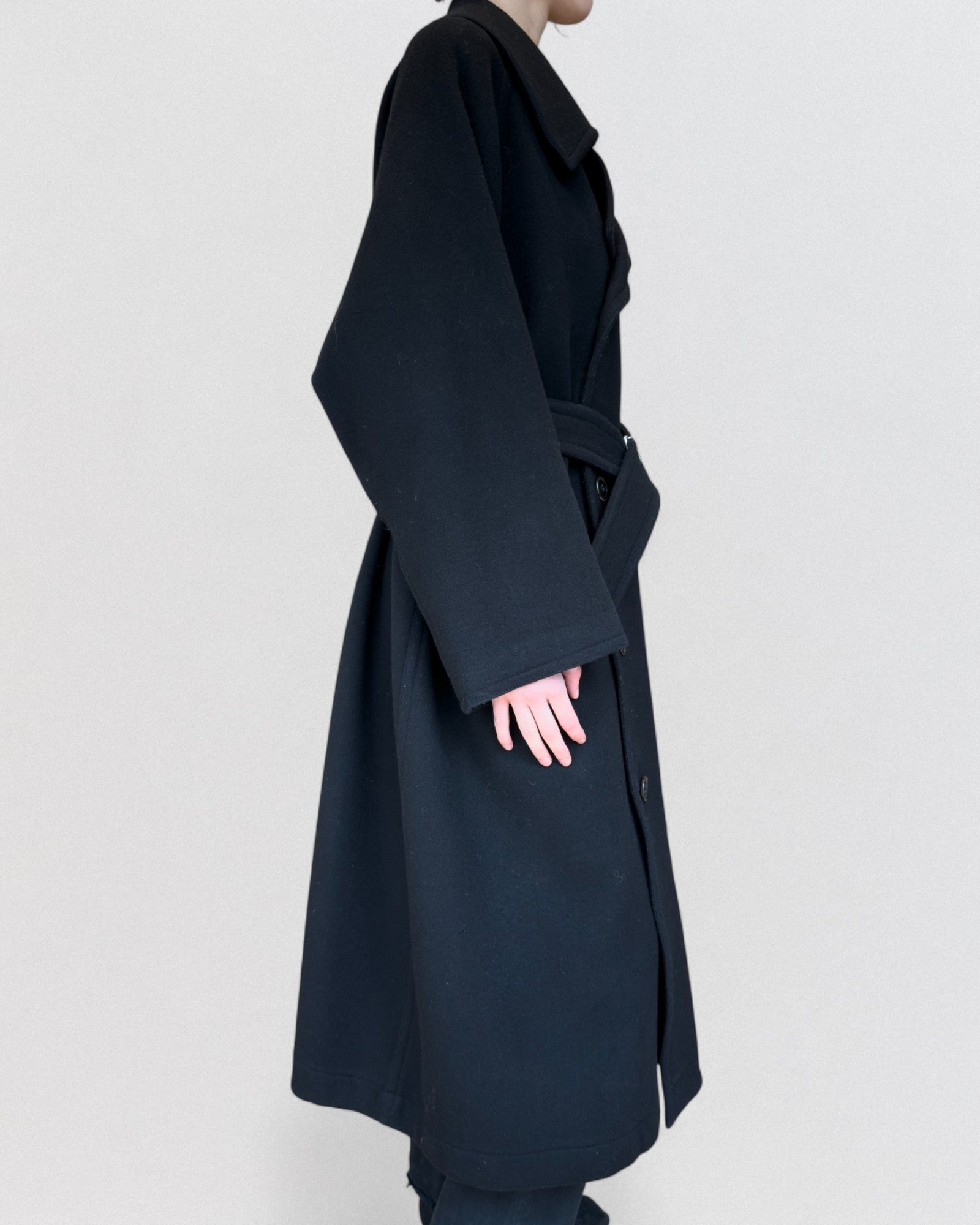 Yohji Yamamoto coat from the Fall/Winter 2002 collection. Executed in heavy black wool, this piece exemplifies Yamamoto’s architectural approach to outerwear. The design features a voluminous, double-breasted construction with exaggerated drop shoulders, a sculptural collar, and an oversized matching belt cinched with a minimalist metal clasp. Unlined