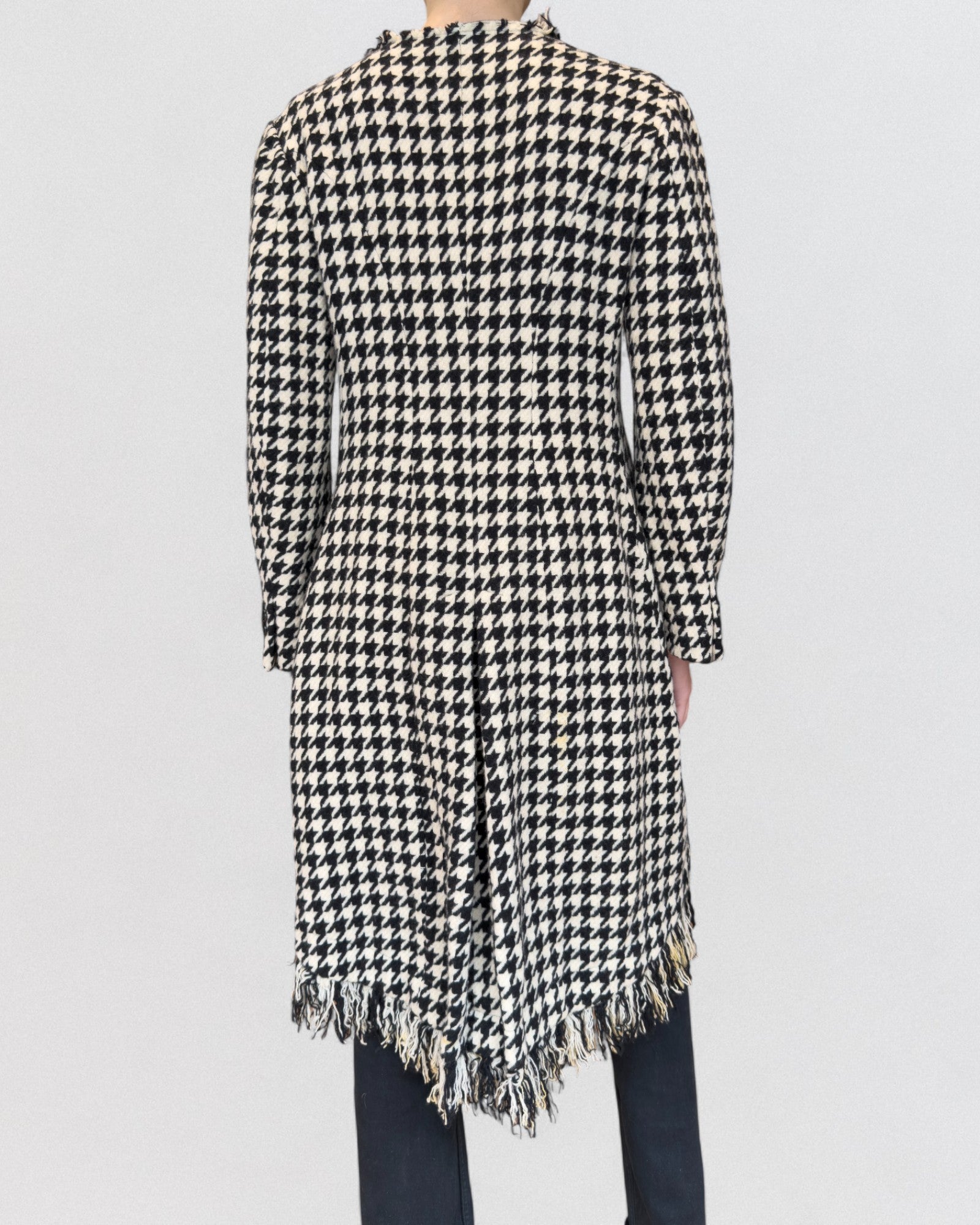 Tailored coat from Yohji Yamamoto Fall/Winter 2003 collection. Constructed from heavy black-and-cream houndstooth wool, featuring a deconstructed asymmetric hemline and raw fringed edges along the lapel and hem