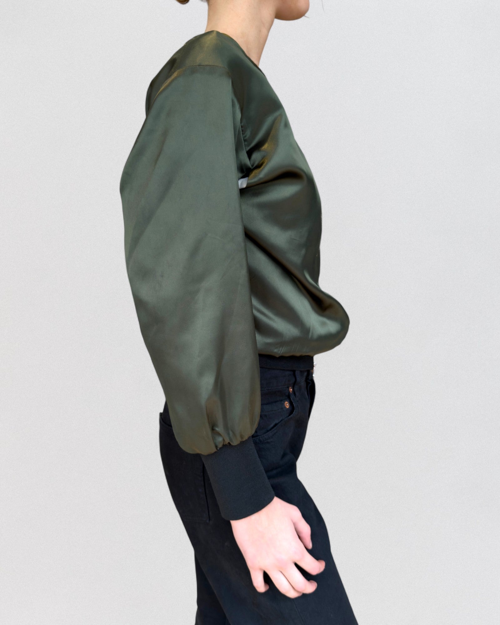 Minimalist bomber jacket from Yohji Yamamoto’s Spring/Summer 2002 collection. Constructed from lustrous olive silk with a subtle sheen, featuring a full front zipper, dropped shoulders, and ribbed knit cuffs and waistband